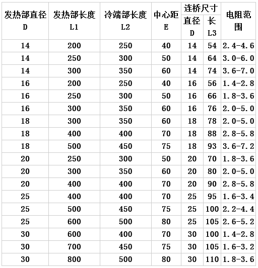 U型硅碳棒規(guī)格、電阻范圍表: